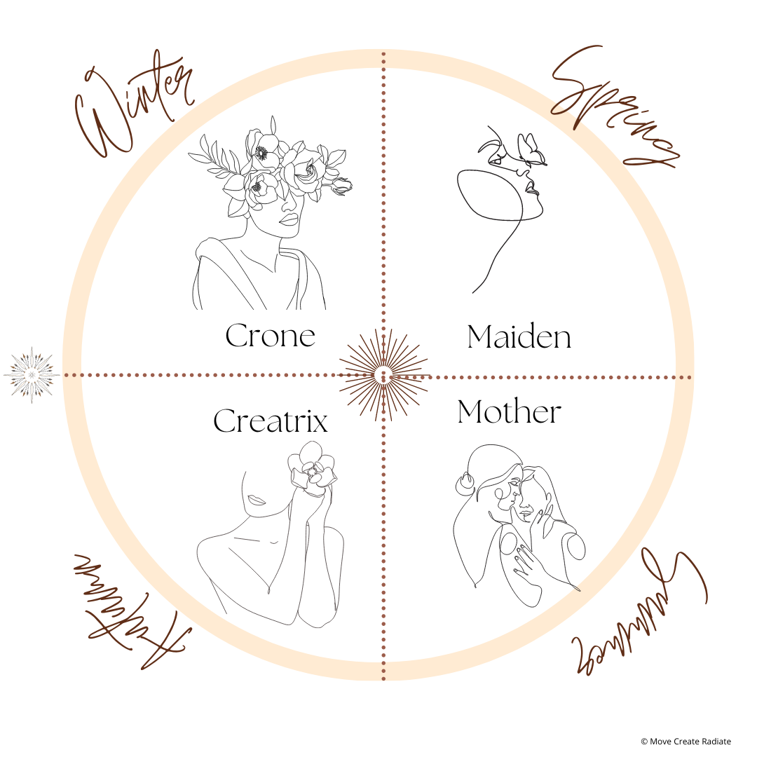 Women embody various archetypes throughout their lives that are echoed throughout the phases of her menstrual cycle. Each cycle, the menstrual phases emulate the four phases of a woman’s life. This same cycle is also mirrored by the phases of the moon. Women are able to tune in to the energy of these archetypes to remember the past, and rehearse the future. Each archetype, and therefore, phase of the cycle holds its own energy, strengths, and weaknesses. By creating an intimate relationship with these archetypes, one can heal past wounds, and prepare for what is to come.