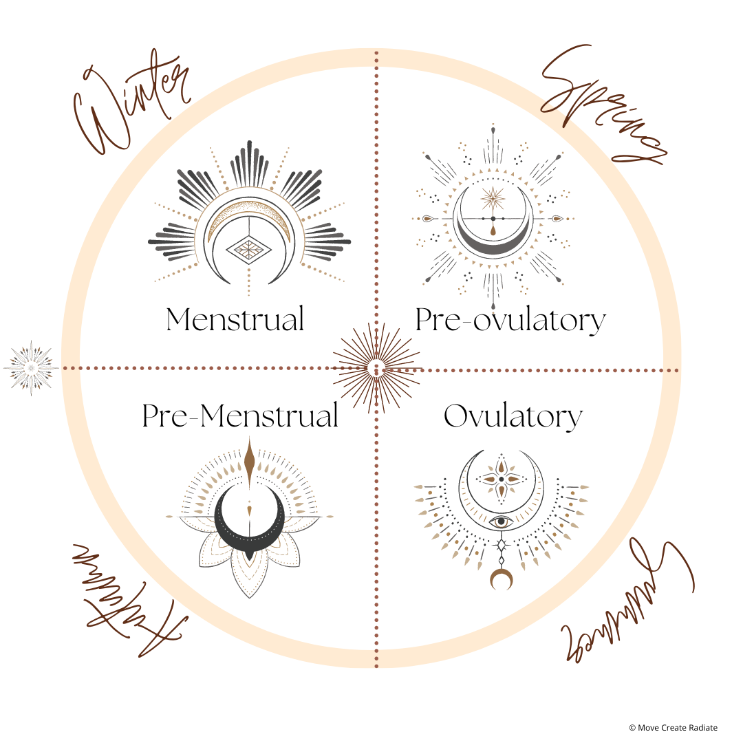 The Pre-ovulatory, or Spring phase of the cycle starts as soon as menstruation finishes. As estrogen increases in this phase, it leads to a boost in serotonin, oxytocin, and dopamine, which can leave you feeling more energetic and creative. The spring phase is characterized by a lighter energy, more creativity, and a higher tendency towards socialization. For those not currently menstruating, the Spring phase shows up with the waxing moon. Superpowers during this phase include: